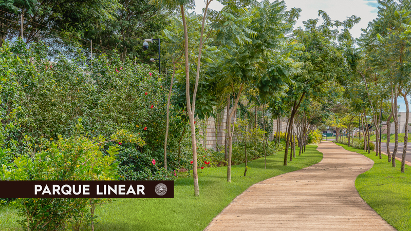 PARQUE COM 7 HECTARES QUE PERCORRE E INTERLIGA O CONDOMÍNIO, COM PISTA DE CAMINHADA E CICLISMO DE 7,5KM, PRAÇAS CONTEMPLATIVAS E ÁREAS DE ALONGAMENTO.
